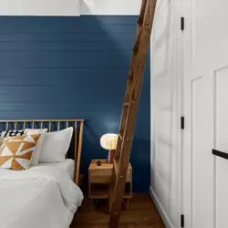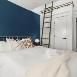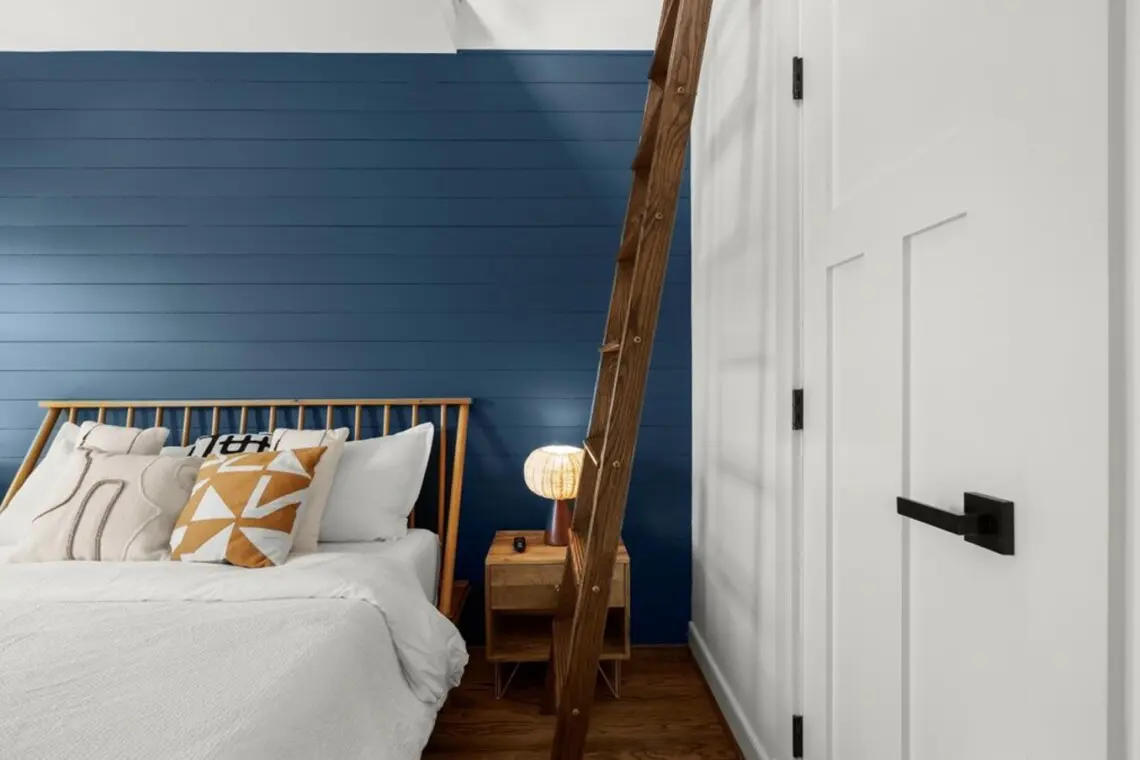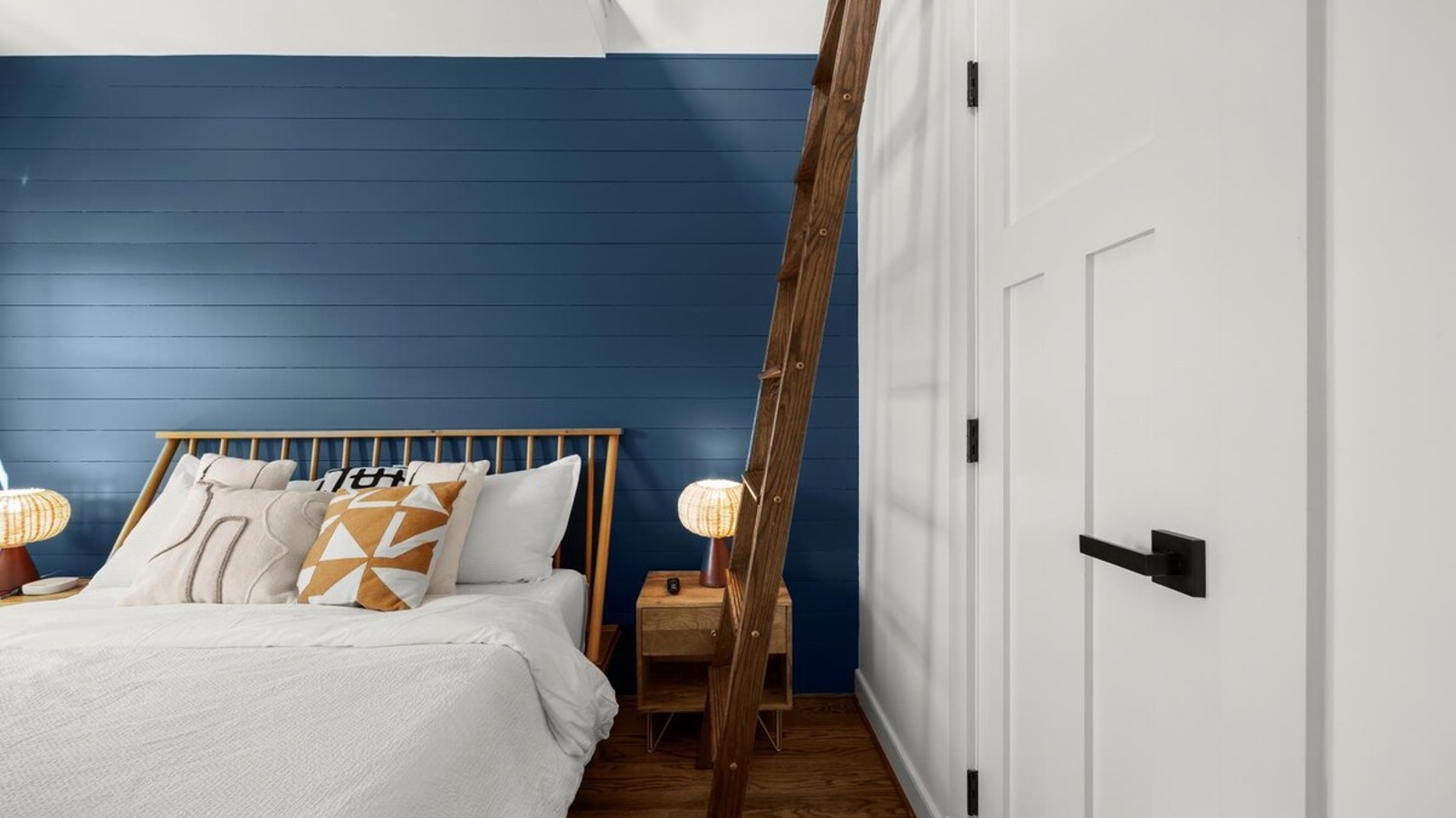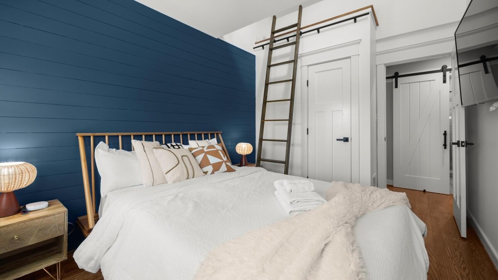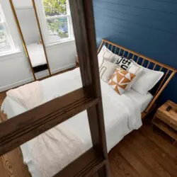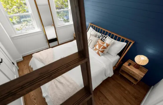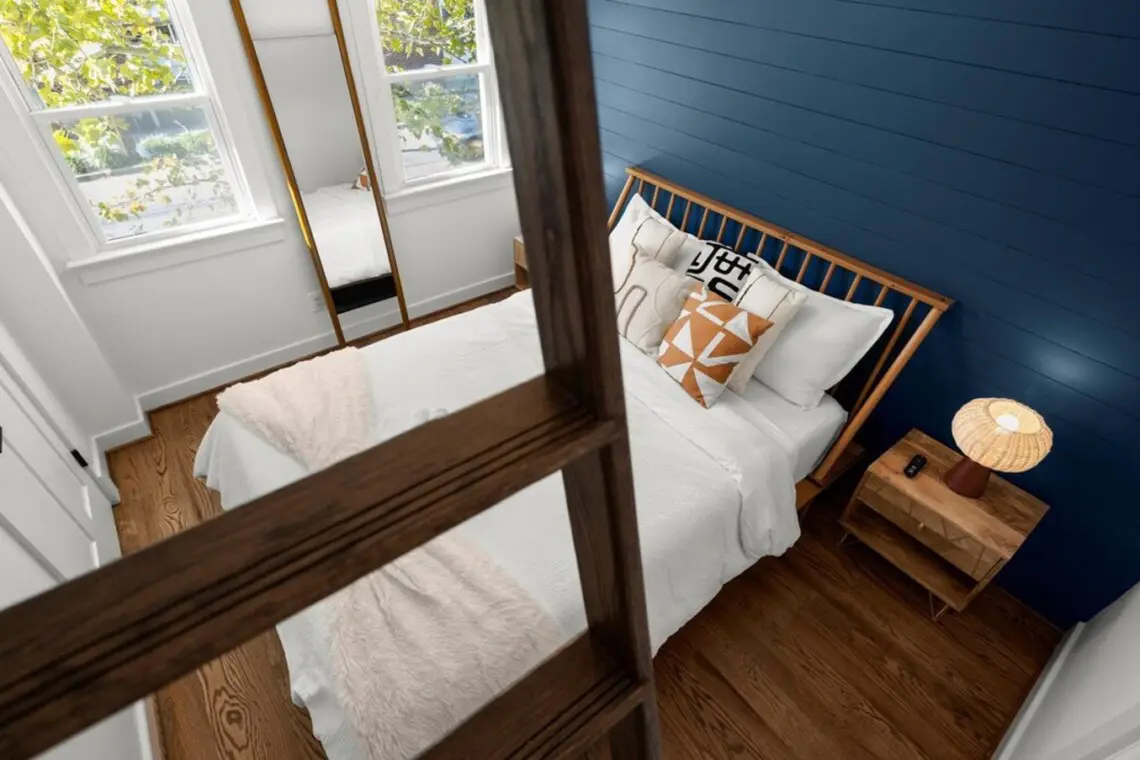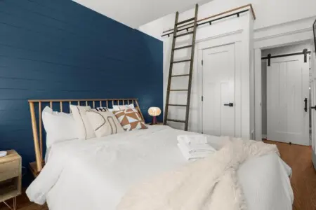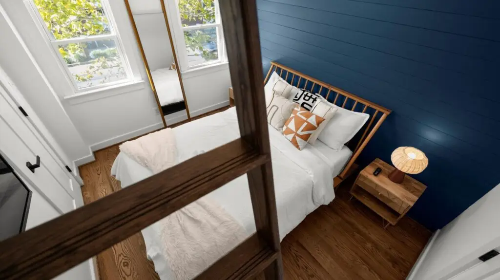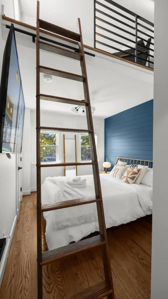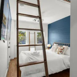 The home features hardwood floors throughout with stairs leading you to the 2nd level of the home where you will find the two bedrooms, and a full-size bathroom. The main bedroom is plush and with it’s room darkening curtains, sleeps two very comfortably in a Queen-size bed. From the main bedroom, there’s a ladder leading up to the loft area, your dedicated workspace with a desk and chair; excellent for Zoom calls or simply a quiet space to get work done. The second bedroom features a Full-size bed. The room is well-lit with a beautiful skylight.