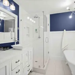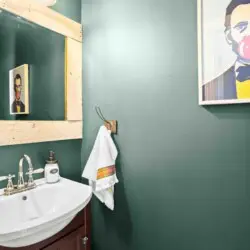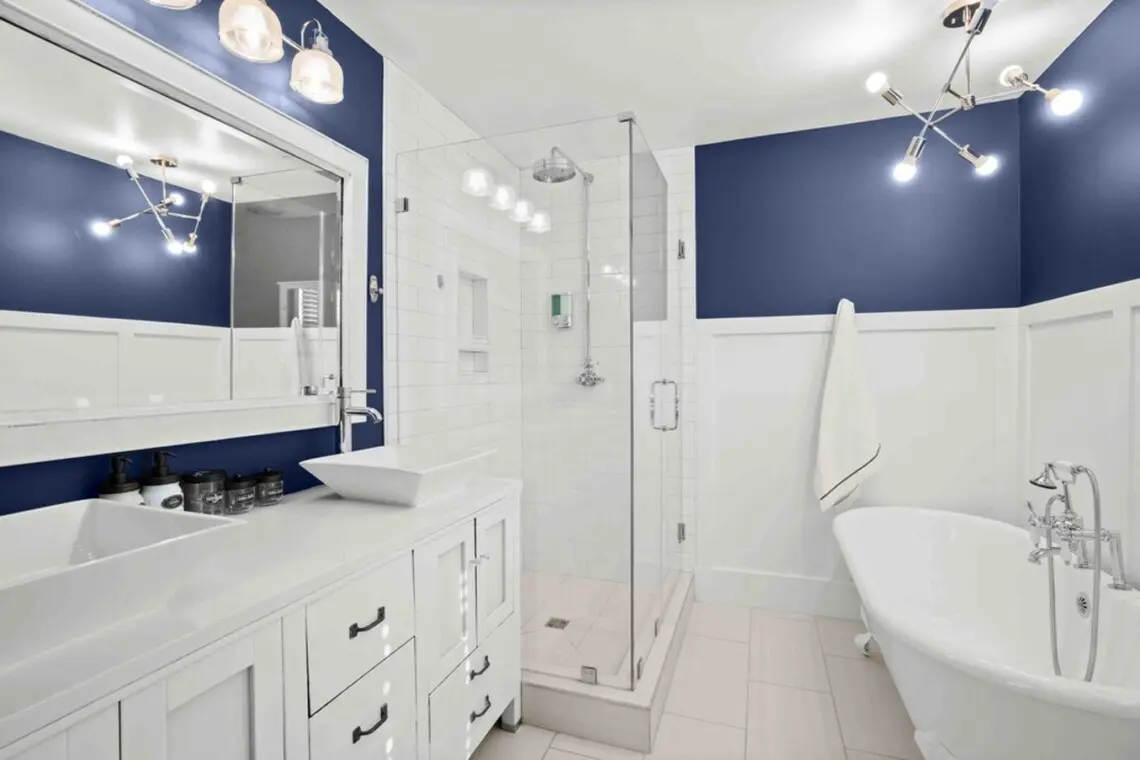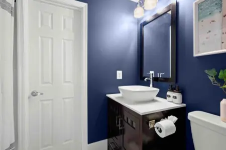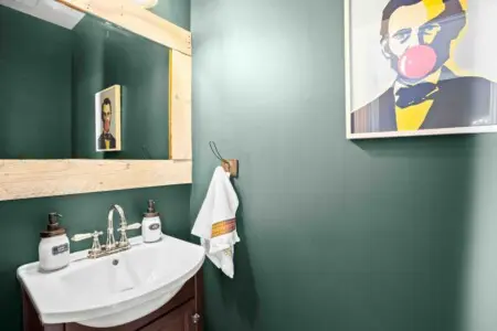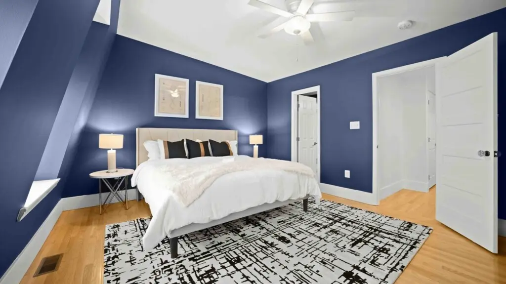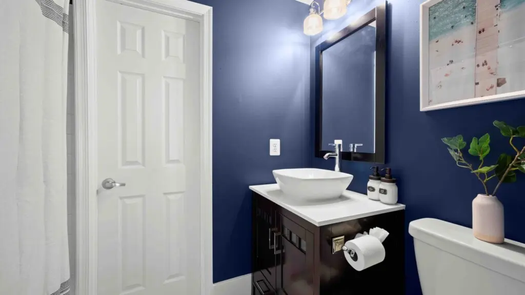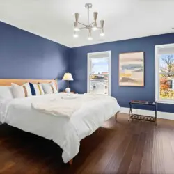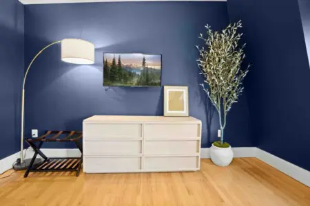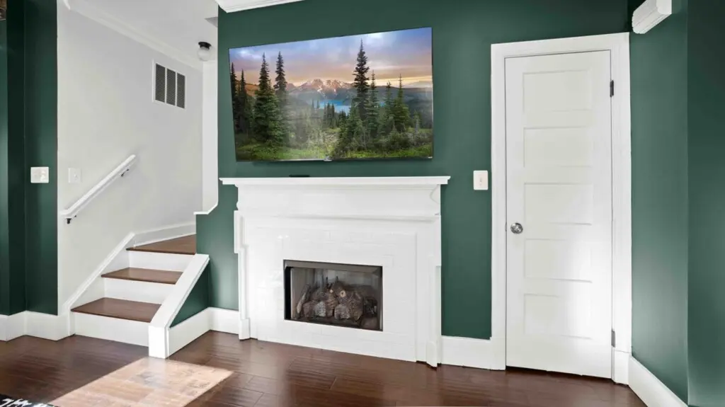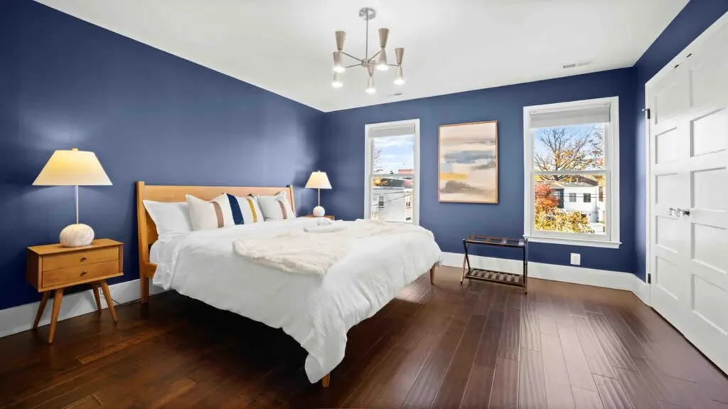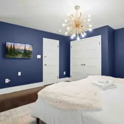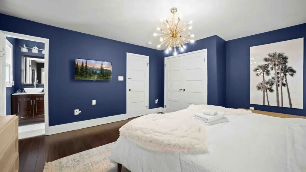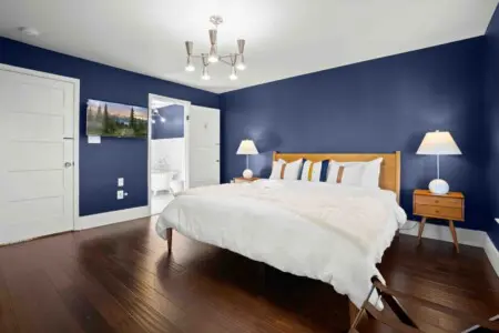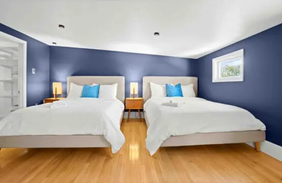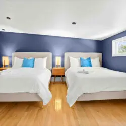 The home features hardwood floors throughout with stairs leading you to the 2nd and 3rd levels of the home where you will find the four bedrooms, and three full-size bathrooms. The 2nd floor bedrooms are plush and sleeps two very comfortably in each King-size bed. They both feature an ensuite bathroom. On the 3rd floor, there’s the 2 full size beds in a room with a dedicated workspace – a desk and chair; excellent for Zoom calls or simply a quiet space to get work done. The second bedroom on the 3rd floor features a King bed as well. On this floor is where you’ll also find the complimentary washer and dryer.