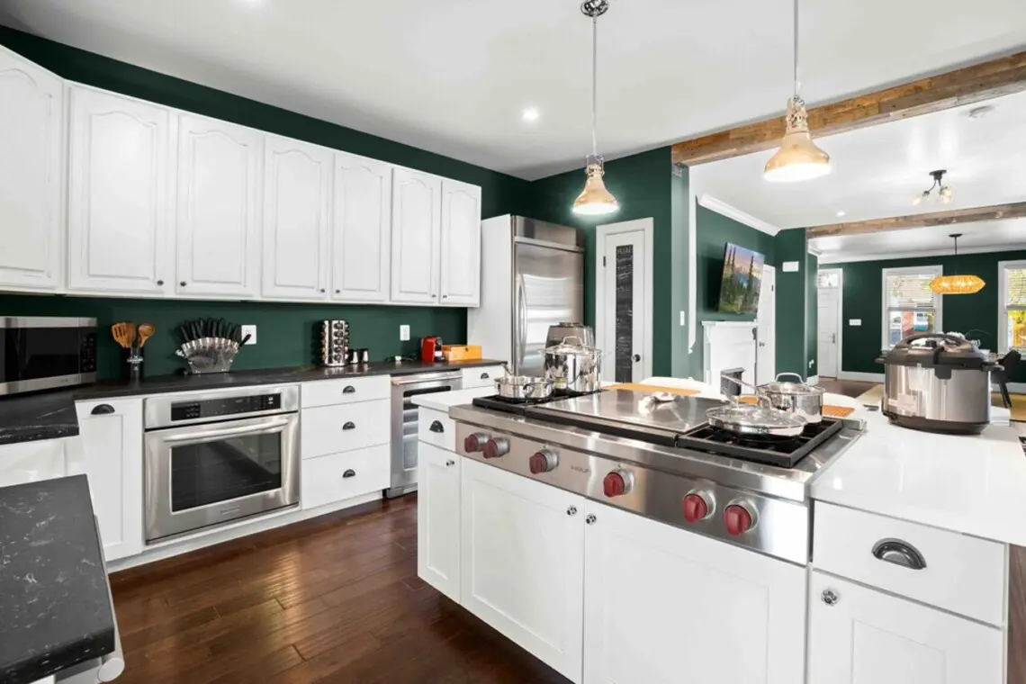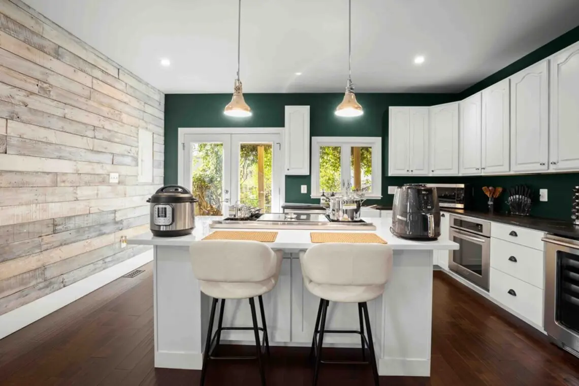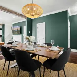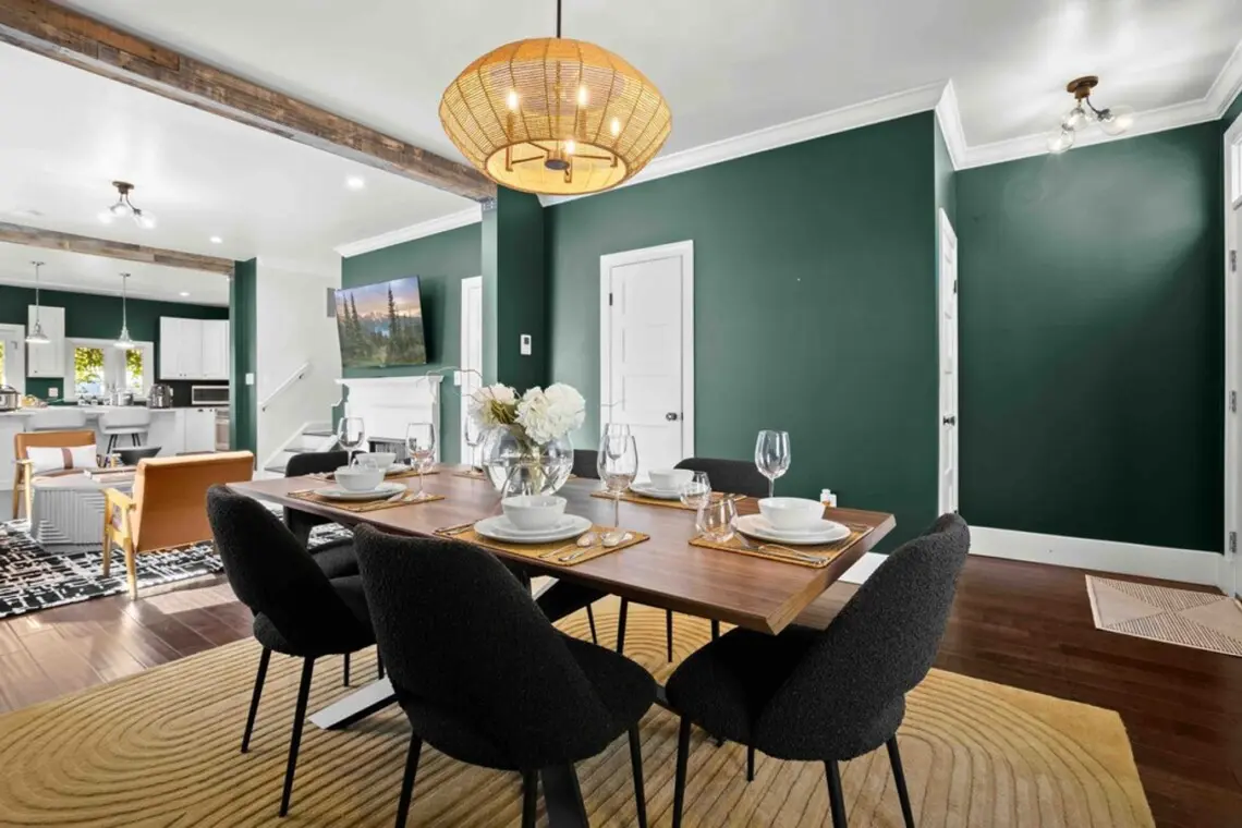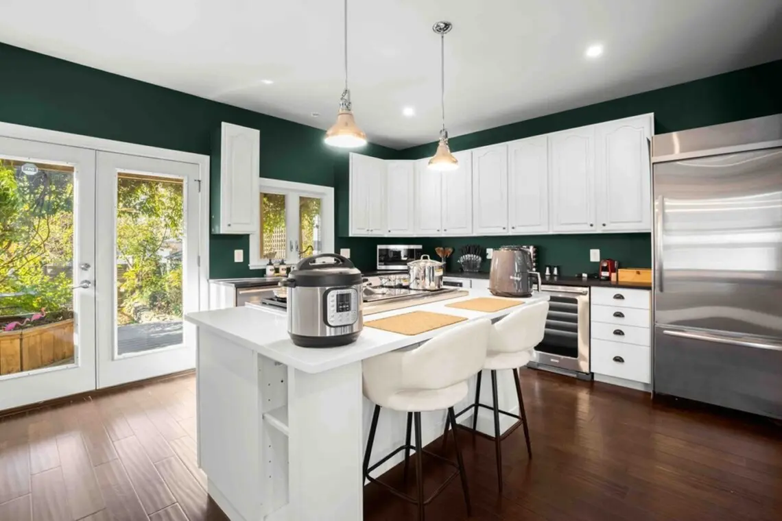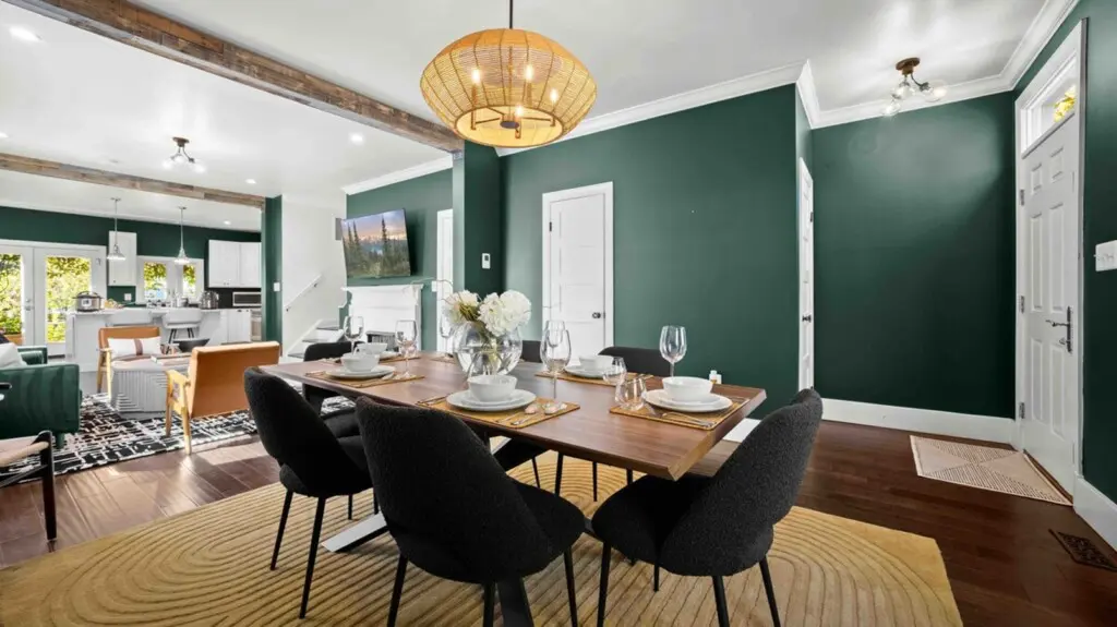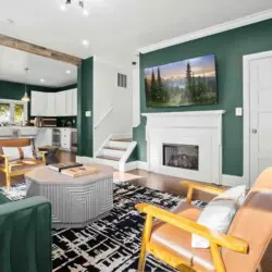 Upon entering the home, you’ll step into the dinning area, with the plush and cozy living room space in the backdrop. It features a smart 65″ TV to stream your favorite movies and shows on Netflix, Hulu, Disney+, etc. The living room, kitchen and dining area are all on the large open space main floor. The beautiful dining area, living room space and kitchen areas are perfectly situated and connected, creating an inviting open space for your entire group to engage in intriguing conversations, gather, dine-in and wine-down. From the kitchen area is the exit to the fully fenced backyard area with a sprawling garden.