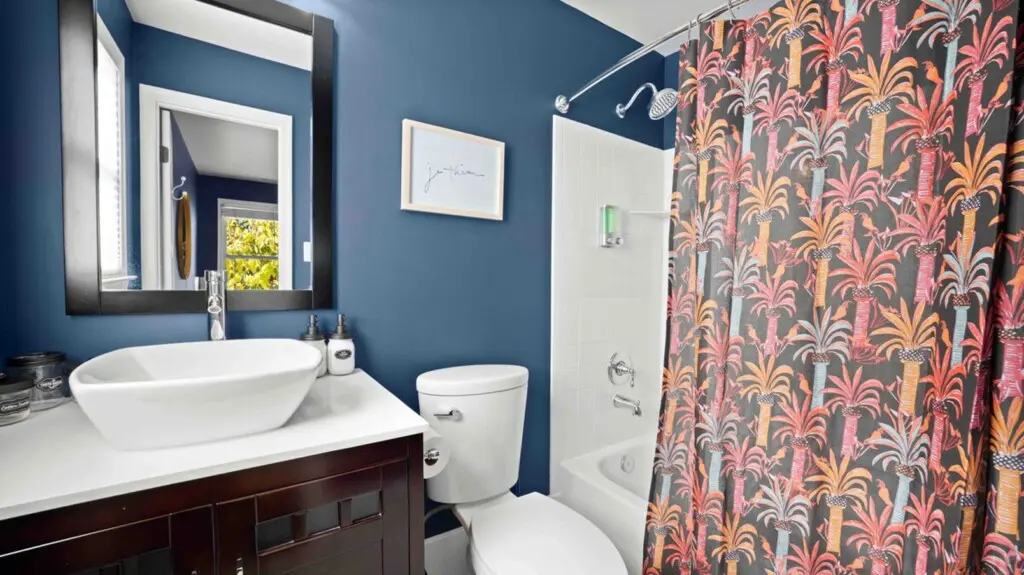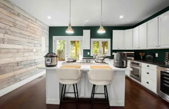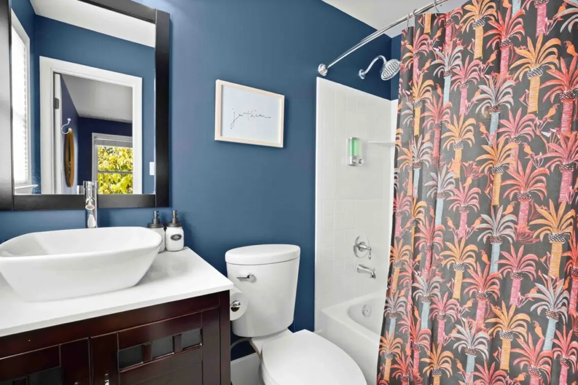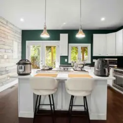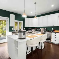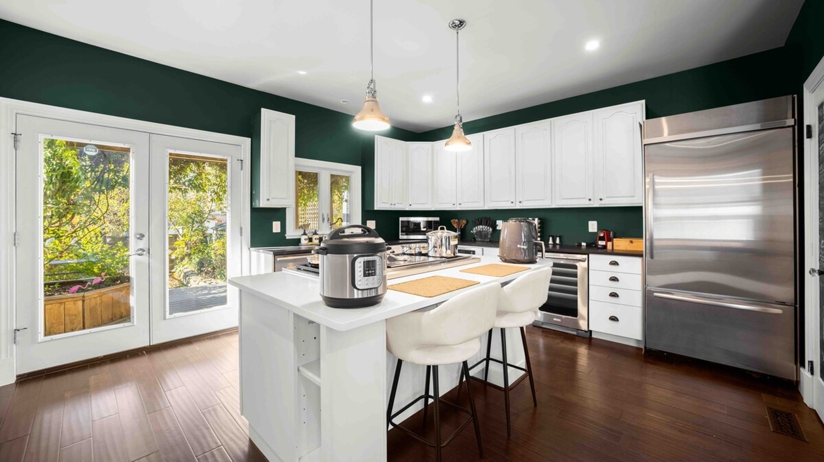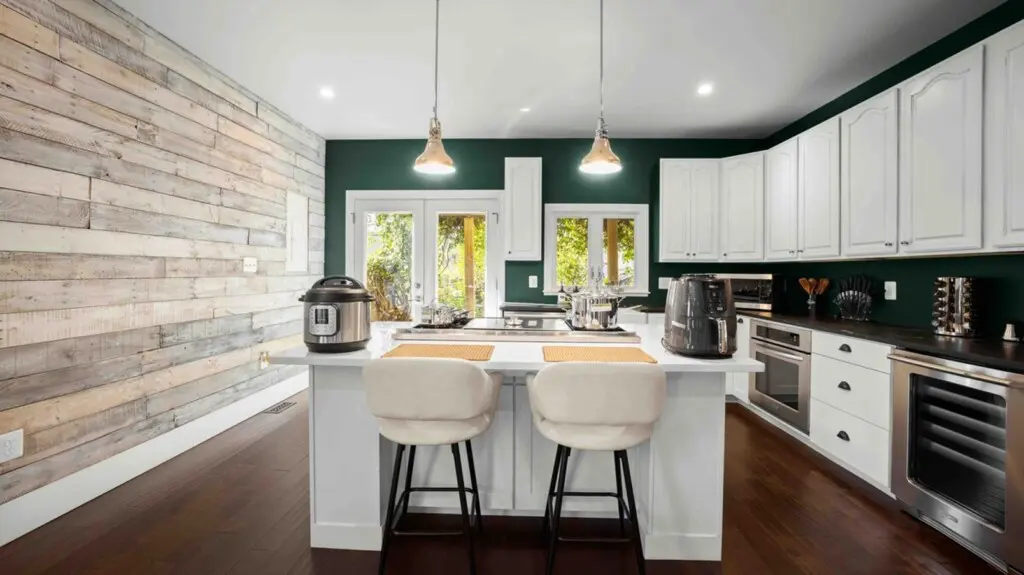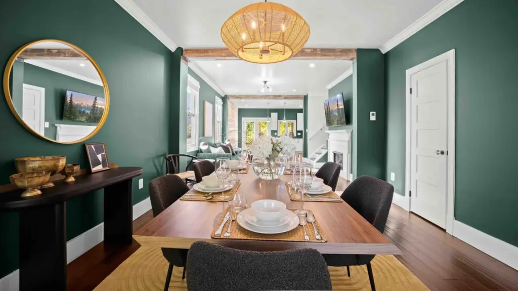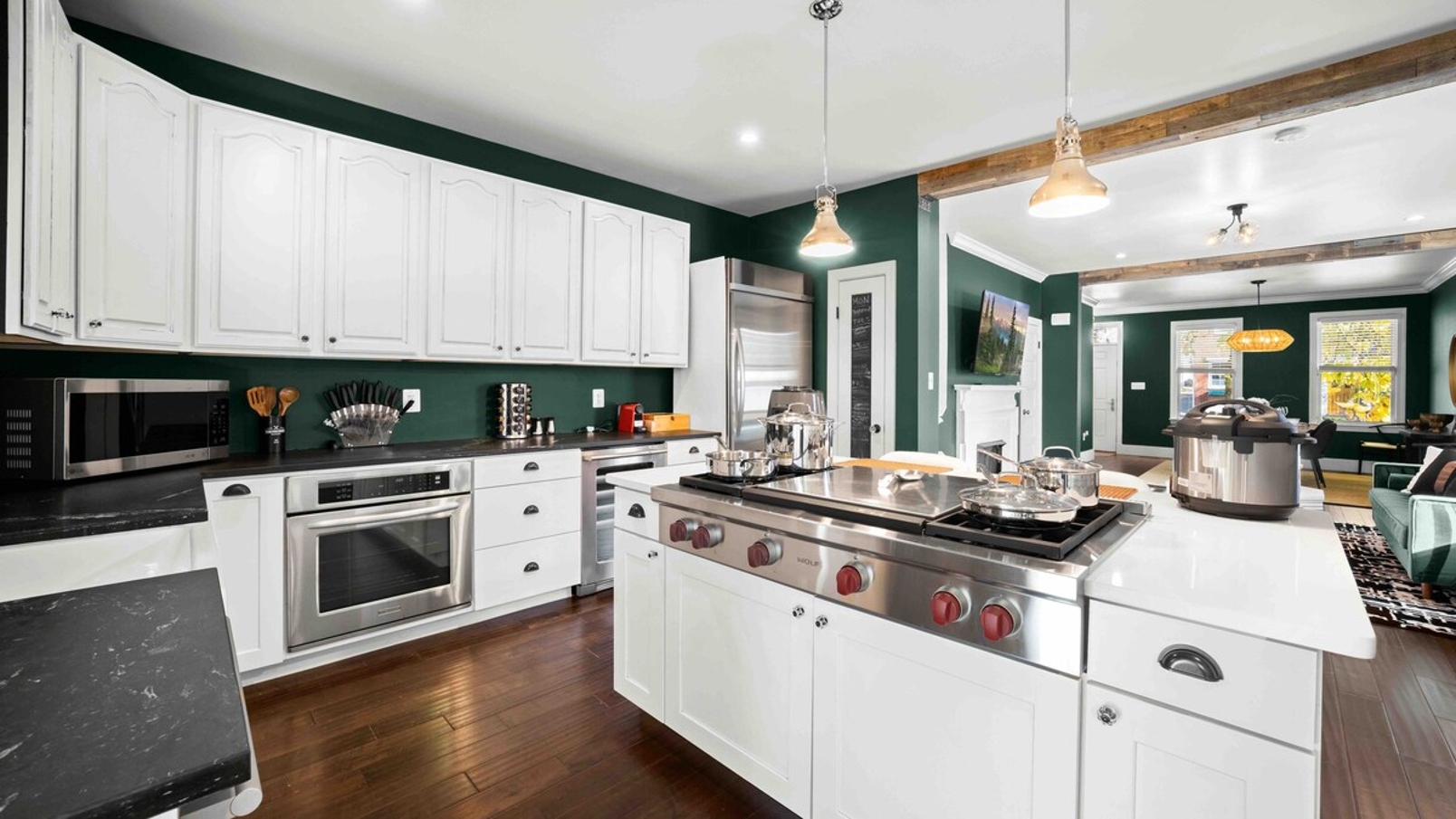Upon entering the home, you’ll step into the dinning area, with the plush and cozy living room space in the backdrop. It features a smart 65″ TV to stream your favorite movies and shows on Netflix, Hulu, Disney+, etc. The living room, kitchen and dining area are all on the large open space main floor. The beautiful dining area, living room space and kitchen areas are perfectly situated and connected, creating an inviting open space for your entire group to engage in intriguing conversations, gather, dine-in and wine-down. From the kitchen area is the exit to the fully fenced backyard area with a sprawling garden.