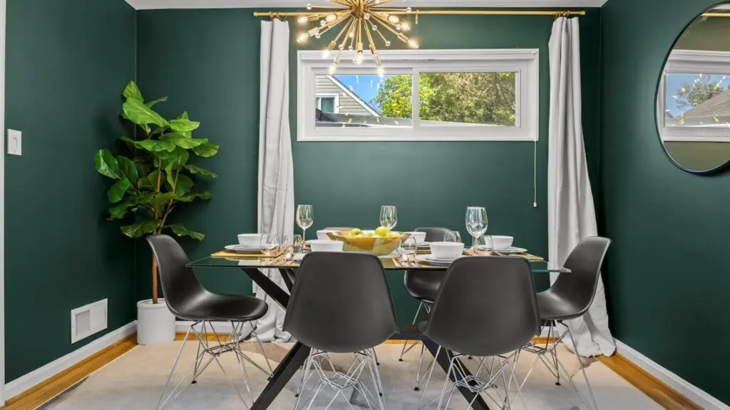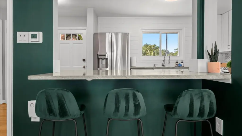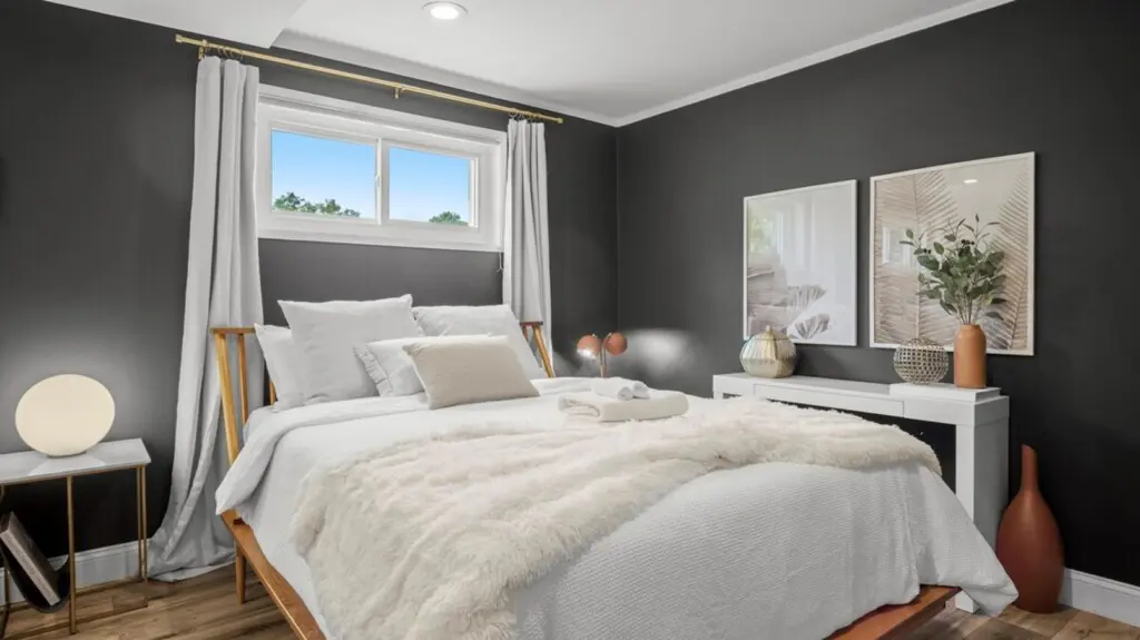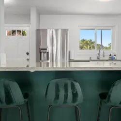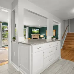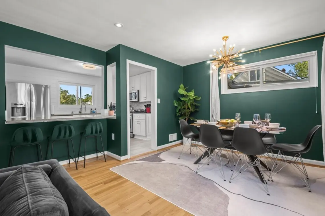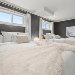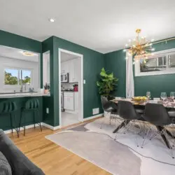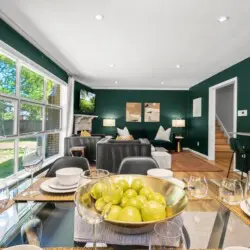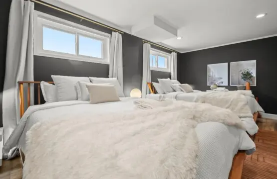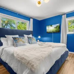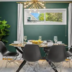 Upon entering the home, you’ll be greeted by the peaceful and cozy living room space directly ahead. To your left, you’ll find the fully equipped kitchen, ready for culinary adventures. On the upper left, the dining area beckons, creating a perfect spot for engaging conversations, shared meals, and relaxation. The split-level layout places the living room, kitchen, and dining area on the upper main floor, while three bedrooms await on the right side (upstairs), with an additional spacious bedroom downstairs.