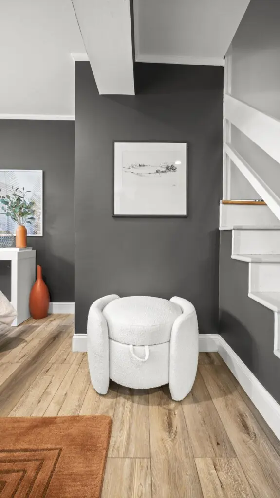 7. The stairs leading to the lower level has a sloped ceiling.