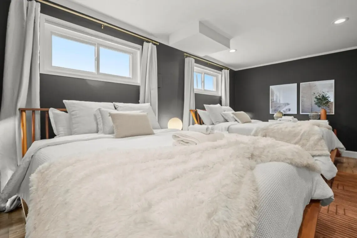 Hardwood floors grace the entire home, adding an elegant touch. Descend the stairs to the lower level, where two bedrooms with king-size beds provide ultimate comfort. The spacious main bedroom downstairs features two queen-size beds and a dedicated workspace, ideal for Zoom calls or productive work sessions. The complimentary washer and dryer are conveniently located in this lower level, ensuring your laundry needs are easily met.