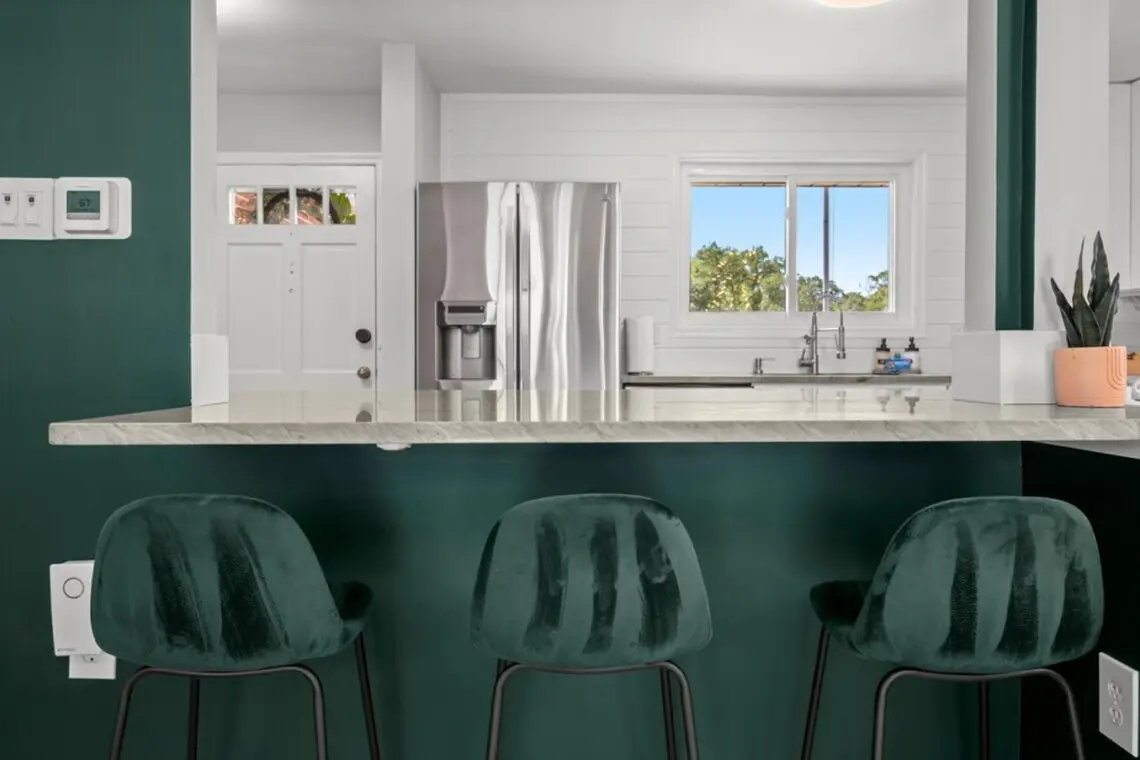 ⇥ Fully equipped + stocked kitchen.