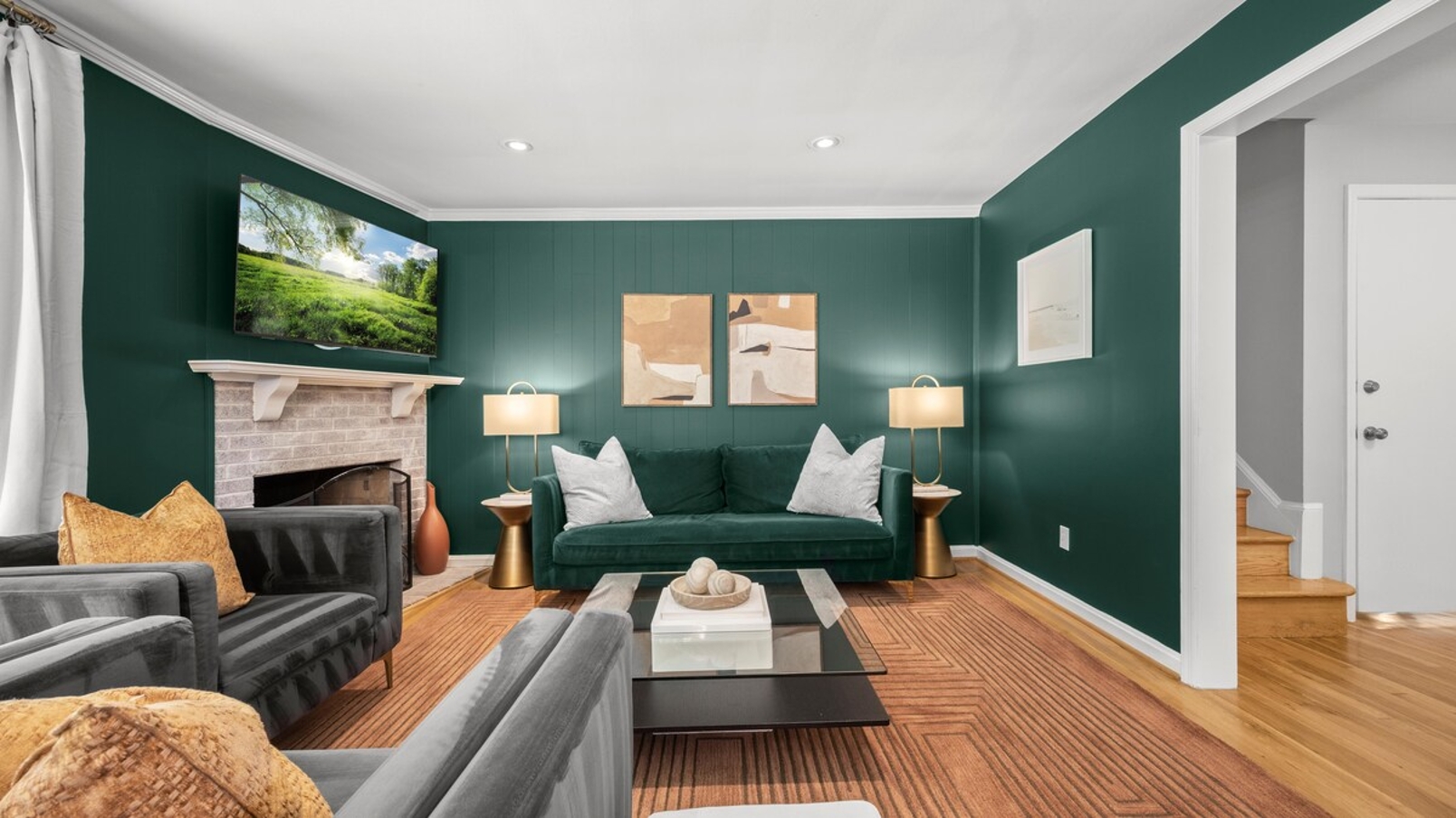 The living room is a haven of entertainment, featuring a smart TV for streaming your favorite movies and shows from platforms like Netflix, Hulu, and Disney+. Each bedroom is equipped with its own smart TV, ensuring personalized comfort and entertainment throughout your stay.
